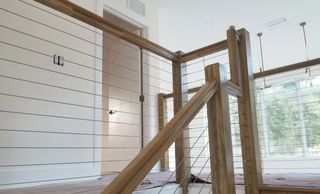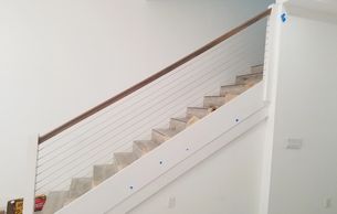 This cable railing is 1/8 thick by 1 x 19 wrap. The posts are wood and painted white. The Cable railing is really simple but really stands out and great if you want that modern look.